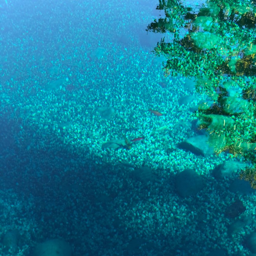 I turned off the pump for a few minutes to see how smooth the surface would get. The water striders kept it rippling a bit but I got some nice shots of how clear the water is getting. You can clearly see the deepest part, which is 7 feet. You can see a forgotten diving ring and the bacteria ball.